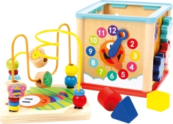 Táto farebná drevená motorická kocka ponúka deťom od 12 mesiacov mnoho spôsobov, ako sa hrať a zároveň sa učiť. Vďaka hodinám s ručičkami sa deti hravou formou zoznámia s časom, korálkový labyrint rozvíja úchop a koordináciu a ďalšie strany kocky precvičujú logiku, tvary aj farby.