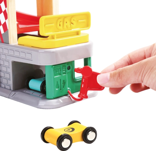 Tri garáže s otvárateľnými dvierkami a tankovacia stanica podporujú nápadité scenáre – od servisnej zastávky po parkovanie a triedenie áut.