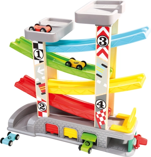 Stabilná konštrukcia z odolných materiálov vydrží každodennú hru, zatiaľ čo praktické garáže poslúžia aj na ukladanie a prenášanie autíčok. Jasné farby a číslované úrovne pomáhajú s rozpoznávaním farieb a základným počítaním. Súčasťou balenia sú štyri hladko pojazdné autíčka na okamžité pretekanie.