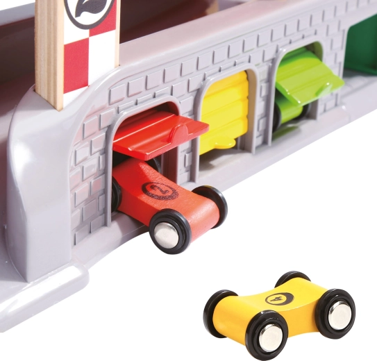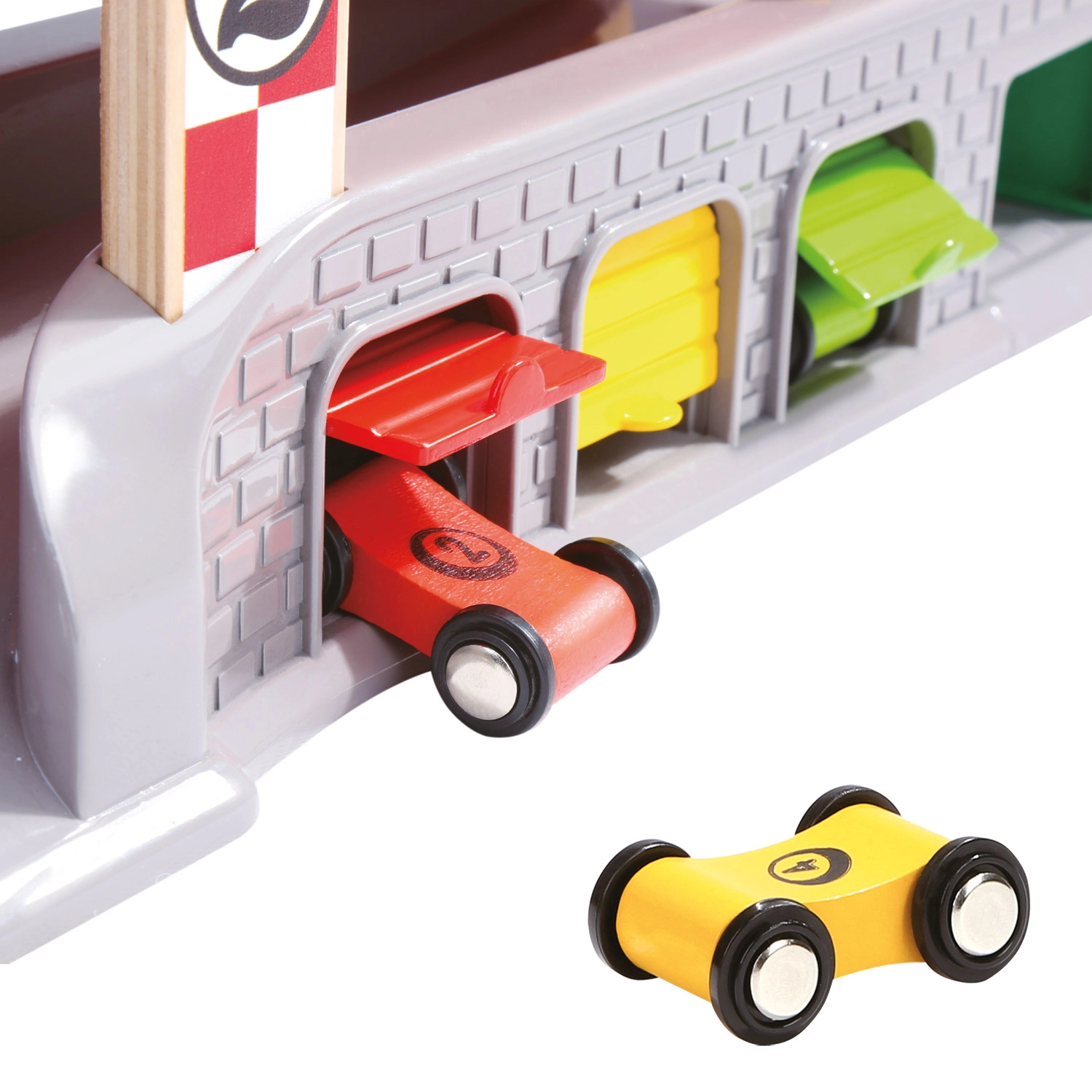 Rozbehnite preteky naplno s autodráhou, ktorá ponúka dvojicu štartovacích plošín, boxy na tankovanie a tri garáže s otvárateľnými dvierkami. Robustná kombinácia drevá, plastu a kovu zaručuje odolnosť, zatiaľ čo živé farby priťahujú pozornosť a podporujú detskú fantáziu. Súčasťou sú 4 rôznofarebné autíčka pre nekonečnú porciu pretekárskej zábavy.