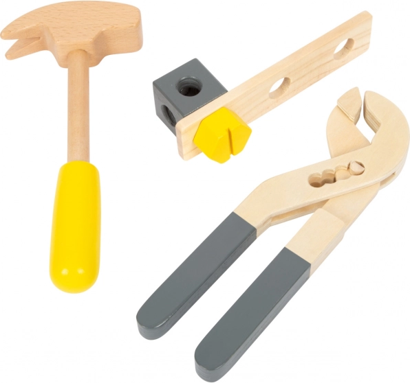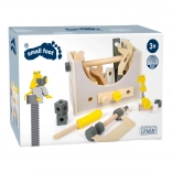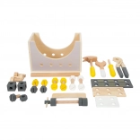Súčasťou je 5 kusov dreveného náradia – kladivo, kľúč, skrutkovač, hasák a zverák – plus dostatok doplnkov na kreatívne projekty. Odnímateľná rukoväť a praktické otvory umožnia náradie rýchlo uložiť, takže je debnička ideálna aj na cesty.