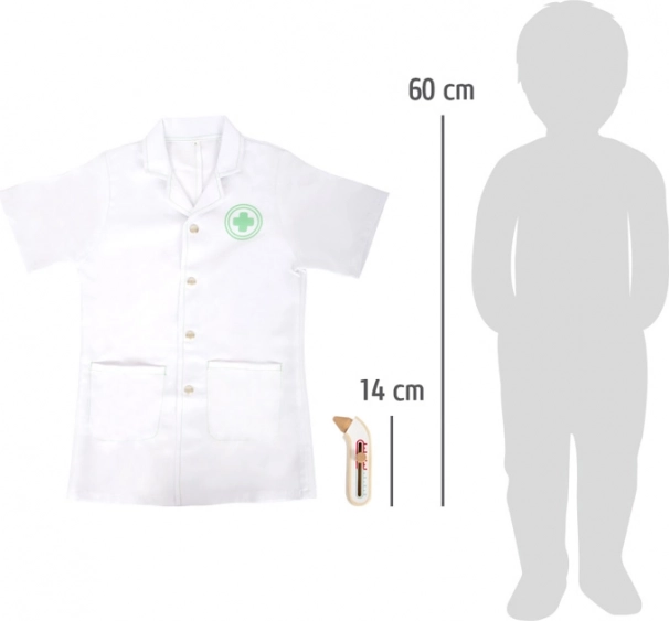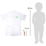 Detský lekársky set small foot prináša všetko, čo malí lekári potrebujú pre svoju prvú ambulanciu. Plášť vo veľkosti 110 je vhodný pre deti vysoké 105–110 cm a vďaka zapínaniu na patentky sa ľahko oblieka aj vyzlieka. Drevené pomôcky sú príjemné do ruky, odolné a bezpečné pre detské hranie.