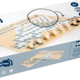 Obojstranná hracia doska je tvorená dvoma dielmi, ktoré držia pevne pohromade vďaka magnetom. Kvalitné drevené figúrky sa príjemne držia a odolný kartónový box umožňuje jednoduché uloženie aj prenášanie. Hra je ideálna pre rodiny a priateľov, podporuje logiku, plánovanie ťahov a trpezlivosť.