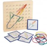 Drevená tabuľa Geoplan je vybavená 64 rovnomerne rozmiestnenými kolíčkami na pevnej drevenej základni o rozmeroch 18 x 18 x 2 cm. Vďaka 48 farebným gumičkám môžu deti vytvárať nekonečné množstvo vzorov a obrazcov od jednoduchých geometrických tvarov po zložité kompozície. Súčasťou sady sú aj 23 vzorových kariet, ktoré pomáhajú precvičovať priestorové plánovanie a logické myslenie.
