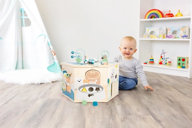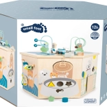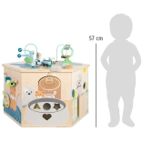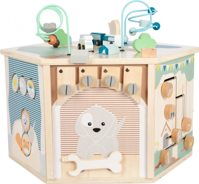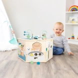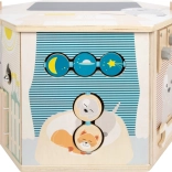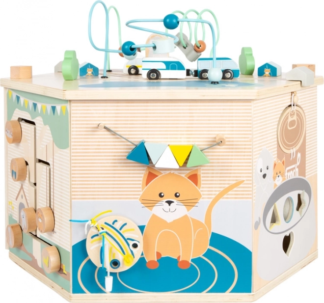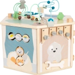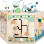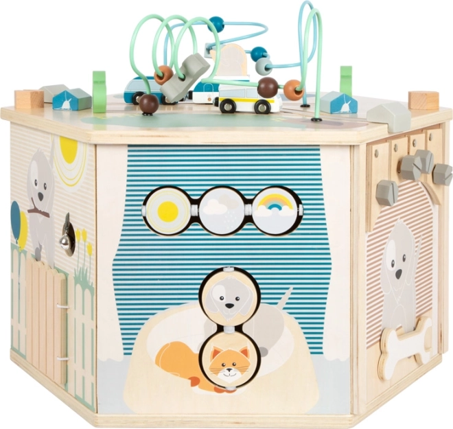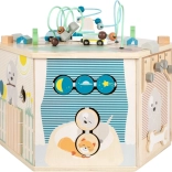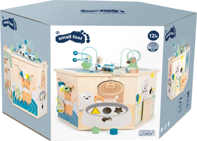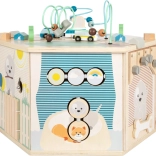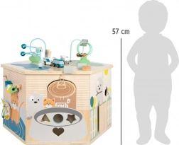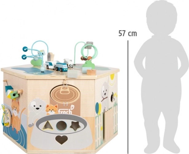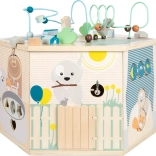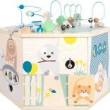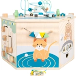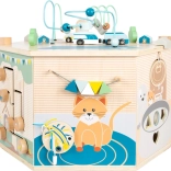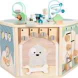 Motorická interaktívna kocka SMALL FOOT Pets XXL je premyslené vzdelávacie centrum pre najmenších. Osem herných panelov rozvíja jemnú motoriku, hmat aj sluchové vnímanie a vďaka detailným ilustráciám približuje deťom každodenný život zvierat. Deti tu objavia korálikový labyrint, vkladačku, otočné doštičky, prevliekačku / triedenie farieb, skladačku a ďalšie interaktívne prvky, ktoré podporujú sústredenie a logické myslenie.
