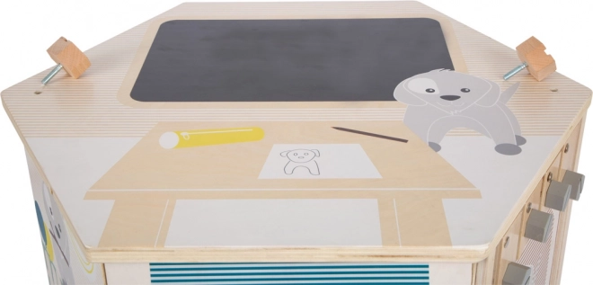 Pevné drevo, jemne ladené farby a pogumované nožičky šetriace podlahu. Veľkorysé rozmery 57 × 50 × 43 cm a výška hracej plochy 32 cm zaručujú pohodlnú hru a perfektnú stabilitu.