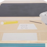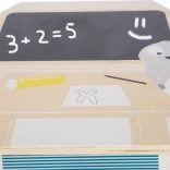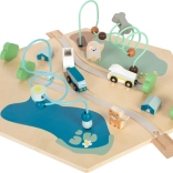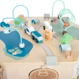 Veko možno rýchlo otočiť bez náradia: z jednej strany korálikový labyrint s vláčikodráhou, z druhej kriedová tabuľa na kreslenie a prvé písanie. V balení nájdete 3 vozidlá – minibus, karavan a príves – pre nekonečné herné scenáre.