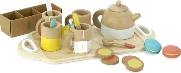 Súprava obsahuje: 4 šálky, 4 lyžičky, 1 kanvicu, 4 čajové vrecká, 2 makrónky, 4 sušienky v krabičke a 1 podnos. Všetko je vyrobené z kvalitného dreva s hladkými hranami pre bezpečnú a dlhotrvajúcu hru. Podporuje rozvoj fantázie, reči a sociálnych zručností.