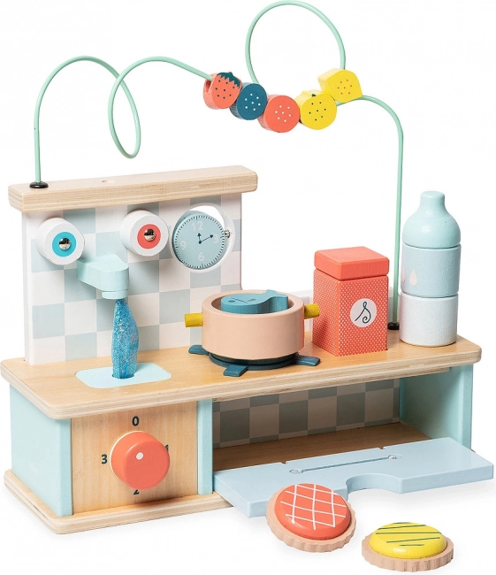Otočné gombíky, hrniec s rybkou, drez s kohútikmi a otváracia rúra podnecujú fantáziu a učia deti bežným činnostiam v kuchyni.