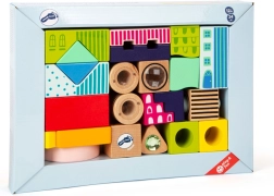Táto zmyslová stavebnica z kvalitného dreva ponúka pútavú kombináciu farieb, tvarov a hmatových i zvukových prekvapení. Zrkadielka, priehľadné „kamienky“, hrkálky a tematické kocky s vláčikom inšpirujú k objavovaniu a tvoreniu, zatiaľ čo veľkorysé tvary presne padnú do detských rúk. Ideálna aj na kombinovanie s prírodnými drevenými kockami.