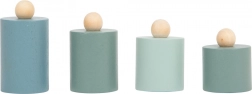 Obsahuje 2 misky a 4 hladko opracované závažia v sivo-modrých tónoch – ideálne pre detský obchod aj domáce učenie.