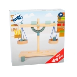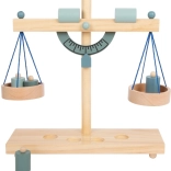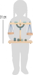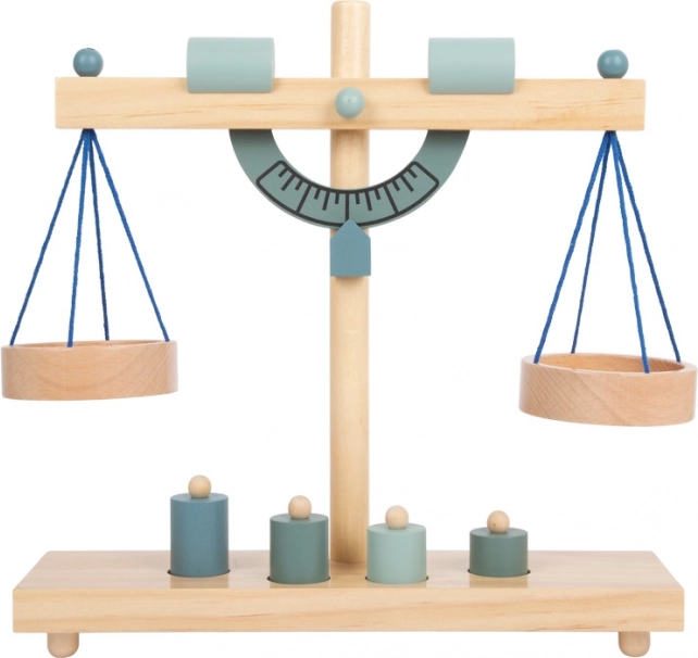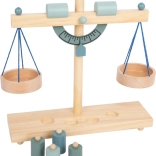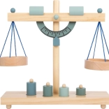 Deti ľahko pochopia princíp vyvažovania vďaka dvom miskám a štyrom dreveným závažiam v rôznych hmotnostiach.