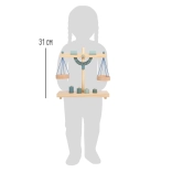 Táto stabilná drevená misková váha je ideálna do detského obchodu aj domácej kuchynky. Dve zavesené misky a sada štyroch drevených závaží umožnia deťom presne vážiť „tovar“ a porozumieť tomu, ako funguje rovnováha. Posuvné protizávažia na ramenách slúžia na jemné doladenie – skvelý spôsob, ako trénovať trpezlivosť a sústredenie.