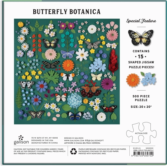 Užite si relaxačné skladanie s puzzle Butterfly Botanica s 500 dielikmi, ktoré zdobia pestré motýle a kvety. Balenie obsahuje aj 15 špeciálne tvarovaných dielikov pre ešte väčšiu zábavu. Vyrobené z recyklovaného papiera a potlačené netoxickými atramentmi v prémiovej kvalite s dielikmi, ktoré do seba presne zapadajú.