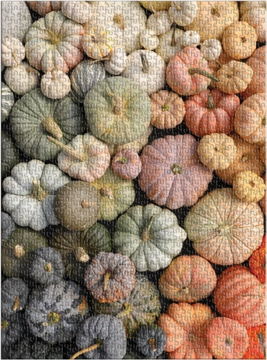 Dizajnérsky motív „Heirloom Pumpkins“ od Christine Chitnis prináša pestrú paletu fialových, zelených, žltých aj oranžových tekvíc. Puzzle je balené v matnej, pevnej krabici, ktorá skvelo poslúži aj ako dárkové balenie alebo štýlový úložný box. V balení nájdete tiež plnofarebnú predlohu hotového obrázka.