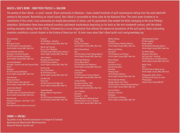 Unikátna kolekcia patchworkových vzorov odráža bohatú tradíciu a kreativitu žien z Gee’s Bend – výsledkom je farebný a vizuálne výrazný obraz.