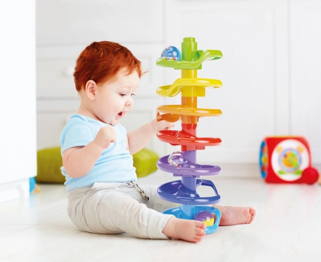 Výnimočnosť tejto hračky spočíva v jej farebných komponentoch, ktoré nielenže stimulujú zrak, ale aj sluch vďaka integrovaným hrkajúcim prvkom vo vnútri guličiek. Vyrobená z kvalitného plastu, táto dráha je bezpečná a prispôsobená aj tým najmenším deťom.
