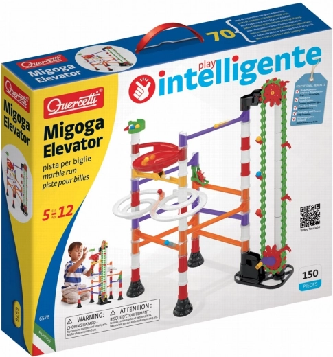 So stavebnicou QUERCETTI Migoga Elevator deti postavia modely podľa obrázkov na krabici alebo môžu slobodne experimentovať s vlastnými návrhmi. Vďaka vzájomne kompatibilným dielom vznikajú nekonečné kombinácie dráh s perfektným sklonom pre plynulý pohyb guličiek. Vertikálny reťazový výťah dopraví guličky späť na štart a postará sa o neprerušenú jazdu.