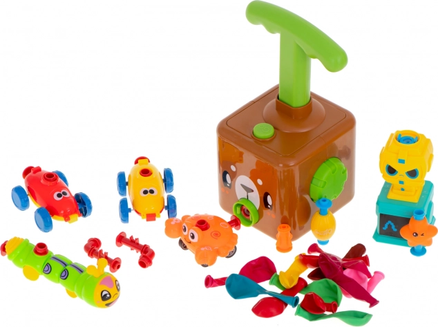 Súčasťou je roztomilá pumpa s motívom medvedíka, 2 autíčka, balóniky a ďalšie prvky (krab, hviezdica, húsenica a pod.), s ktorými možno organizovať preteky, pokusy a súťaže o rýchlosť a dojazd. Vďaka prevádzke bez batérií je sada ekologická, tichá a vhodná na domácu aj skupinovú hru.