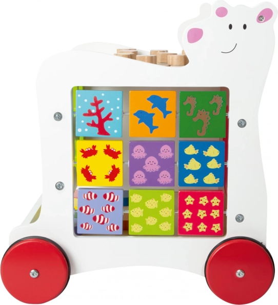 Vďaka pogumovaným kolieskam je pohyb tichý a šetrný ku všetkým typom podláh. Chodítko navyše ponúka úložný priestor na kocky a drobnosti, takže je herný kút vždy rýchlo uprataný.
