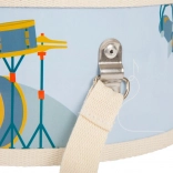 Vďaka nastaviteľnému a odnímateľnému popruhu si deti môžu bubienok pohodlne zavesiť a hrať kdekoľvek. Paličky so špeciálnymi tlmiacimi koncovkami zabezpečujú príjemnejší, menej hlučný zvuk – ideálne do detskej izby aj na cesty.