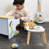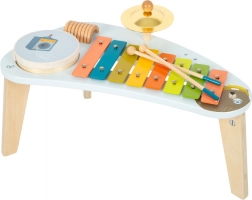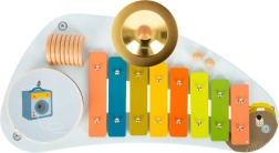 Hudobný stolík Groovy Beats small foot je premyslený set pre prvé muzikantské krôčiky. Vďaka pevnej drevenej konštrukcii a trom stabilným nohám zvládnu deti bezpečne skúmať rôzne zvuky – od melodických tónov xylofónu cez jasné cinknutie činelov až po beaty odnímateľného bubna. Farebne kódované klapky zjednodušujú učenie a podporujú rýchle úspechy.