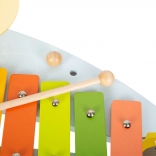 Súčasťou balenia sú dve robustné paličky z masívneho dreva a prehľadné noty (napr. jednoduché detské pesničky), aby bolo hranie intuitívne a zábavné od prvého dňa. Veselo ladený dizajn kombinuje prírodné drevo s modernými modrými tónmi, takže sa set hodí do každého detského izbičky.