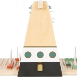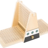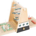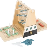 Hľadajte súperove lode a chráňte svoju flotilu v modernom drevenom prevedení hry Lode. Stredová doska zabezpečuje súkromie rozostavenia a prehľadné označenie zásahov aj minel – modré vlajočky pre okolie lodí, biele pre priame zásahy. Vďaka magnetom v ráme je celá konštrukcia pevná a stabilná, takže všetko drží na svojom mieste aj počas napínavých súbojov.