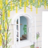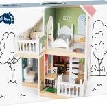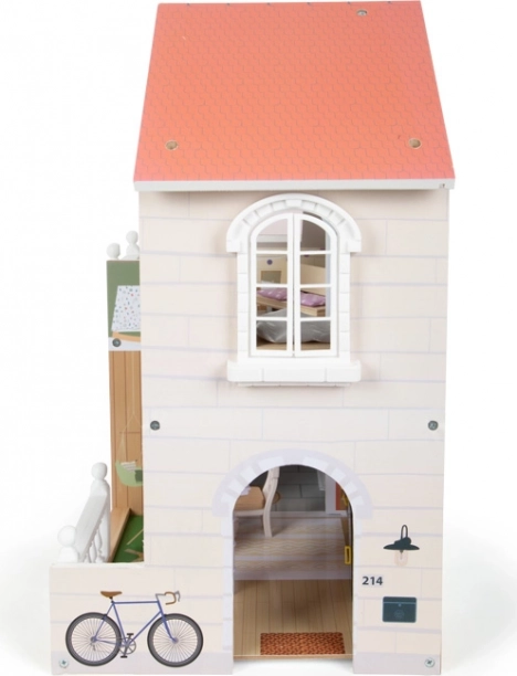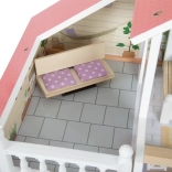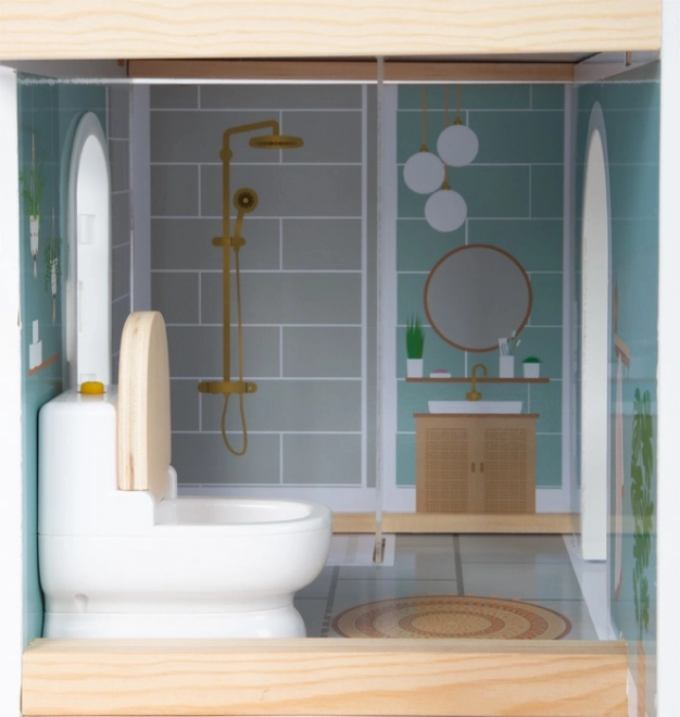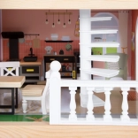 Štýlový drevený domček pre bábiky s otvorenou prednou stranou ponúka tri miestnosti, terasu a záhradku pre realistickú hru. Nechýba točité schodisko, otvárateľné okná, moderná kúpeľňa s plexi stenou a 8 ks funkčného nábytku s textilnými doplnkami. Kompaktné a stabilné spracovanie v svetlom, modernom dizajne je ideálne do detskej aj obývacej izby.