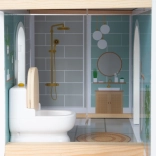 Štýlová kúpeľňa na prízemí má plexisklovú stenu sprchy a otvárateľnú toaletu pre ešte autentickejšiu hru.