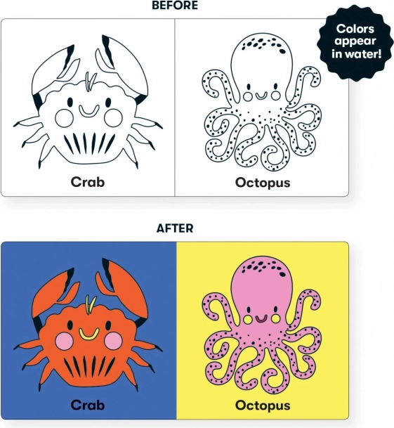 Objavte kúzlo jedinečných hračiek do kúpeľa. Na prvý pohľad nenápadná obrázková knižka po namočení roztomilo ožíva pestrými farbami. Ľahko upúta pozornosť detí a zabaví ich pri umývaní, pričom pomáha rozvíjať ich poznávacie zručnosti. Proporcie hračky sú zvlášť prispôsobené drobným a neobratným detským ručičkám. Hlavné vlastnosti: 6 strán s obrázkami, aktivácia farieb ponorením do vody, grafický návrh Marijke Buurlage