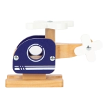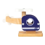 Drevená helikoptéra má prirodzenú drevenú úpravu s modrými a bielymi detailmi, čo jej dodáva hravý vzhľad a činí ju bezpečnou pre deti.
