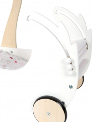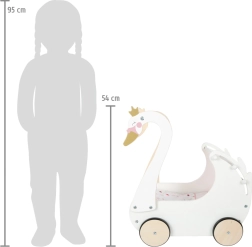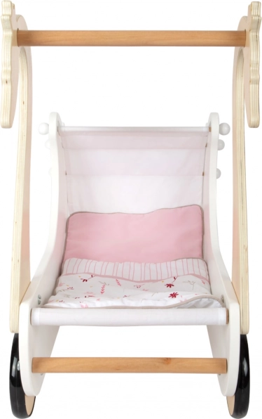 Vyzdobený v jemných farbách a jednoduchých tvaroch, tento kočík pre bábiky zútulní ich každodennú starostlivosť. Vďaka svojej robustnej konštrukcii môže pojať bábiky do veľkosti 46 cm. Kočík je vybavený sťahovateľnou látkovou strieškou a v balení nájdete dvojdielne kvetinové ružovo-biele posteľné prádlo. Pogumované kolieska zabezpečujú tichý a plynulý pohyb na každom povrchu, zatiaľ čo precízne spracovaná konštrukcia z odolnej preglejky a masívneho dreva ponúka dlhodobú životnosť.