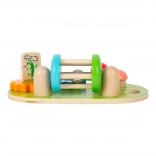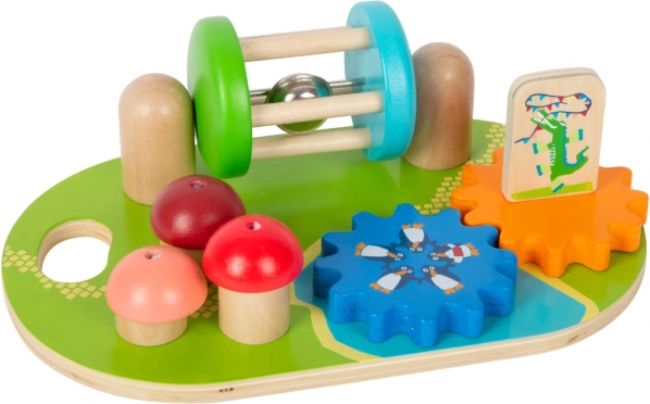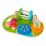 Drevená doska ponúka rôzne pohyblivé prvky ako ozubené kolieska a hubičky na rozvoj jemnej motoriky.