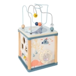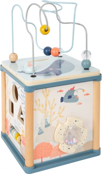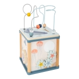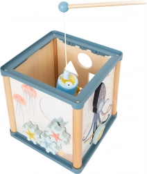 Táto drevená aktívna kocka s motívom podmorského sveta ponúka päť strán plných aktivít a navyše zábavný magnetický rybolov – dieliky z vkladačky možno chytať magnetickou udicou priamo vo vnútri kocky. Farebné ilustrácie morských tvorov podporujú zrakové vnímanie, pružná chobotnica zas pridáva hravý prvok, ktorý deti motivuje k ďalším objavom.