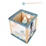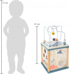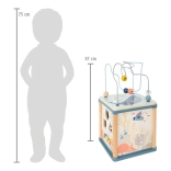 Na jednotlivých stranách deti nájdu korálkový a posuvný labyrint, počítadlo, otočné hrkálky, ozubené kolieska so zrkadielkom a vkladačku. Hračka rozvíja koordináciu ruka–oko, logické myslenie a trénuje sústredenie. Veko možno otočiť a všetky diely aj labyrint upratať dovnútra – kocka tak nezaberá miesto a vyzerá skvelo aj na poličke.