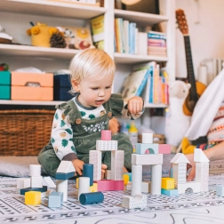Táto nadčasová drevená stavebnica ponúkne deťom nekonečné možnosti stavania – od jednoduchých veží až po malé architektonické skvosty. Kocky sú navrhnuté tak, aby skvele sadli do malých ručiek, a vďaka zaobleným hranám a hladkému povrchu sa s nimi manipuluje ľahko a bezpečne. Rôznorodé tvary a farby podporujú kreativitu, priestorovú predstavivosť a prvé logické súvislosti.