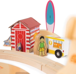 Táto pobrežná vláčkodráha prináša množstvo nápaditej zábavy aj vzdelávania v jednom. Deti môžu krúžiť po dráhe, prechádzať veľkým hradom z piesku, míňať farebné plážové domčeky a pritom sa učiť triediť odpad vďaka praktickým magnetickým zatváracím doskám. Všetko v kvalitnom prevedení zo zodpovedne získaných materiálov s nezávadnými farbami a lakmi.