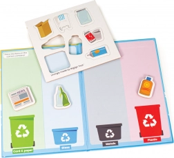 Magnetické zatváracie dosky a tematické prvky vedú deti k porozumeniu recyklácie a ochrane prírody. Hra podporuje zodpovednosť aj praktické zručnosti.