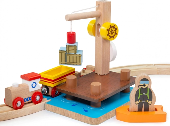 Tento prístavný set dodá vašej vláčkodráhe realistickú atmosféru. Funkčný žeriav s magnetom bezpečne prenáša náklad medzi dokom, vagónmi a člnom, zatiaľ čo figúrka potápača je pripravená na každú záchrannú akciu. Robustné drevené prevedenie zabezpečuje dlhú životnosť a bezpečnú hru.
