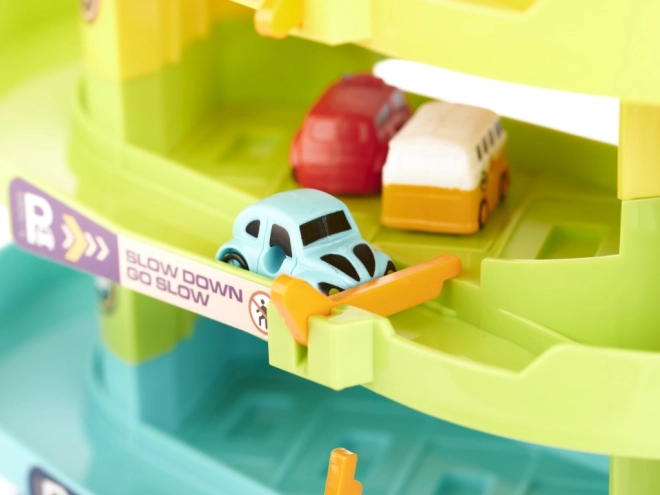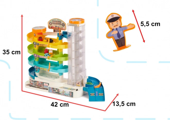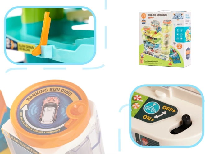 Objavte multifunkčnú parkovaciu garáž, ktorá premení detskú izbu na rušné mesto. Štyri priestranné poschodia ponúknu veľa miesta na parkovanie, výťah vyvezie autíčka až na vrchol a nechýba ani heliport pre obľúbený vrtuľník. Elektrický režim výťahu dopĺňajú veselé svetlá a melódie, v prípade potreby možno výťah ovládať ručne.
