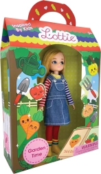 - Bábika LOTTIE záhradníčka, pruhovaný svetrík, džínsové šaty, červené pančuchy, žlté gumáky, lopatka, hrabličky, krhla, 2 krabičky