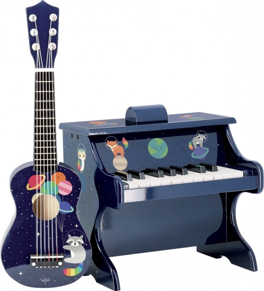Vesmírna gitara nielenže ponúka estetický zážitok, ale je aj funkčnou hračkou, ktorú možno využívať na kreatívnu hru a hudobný rozvoj. Perfektne dopĺňa Dúhové piano, s ktorým tvorí ucelenú kolekciu nástrojov pre deti.