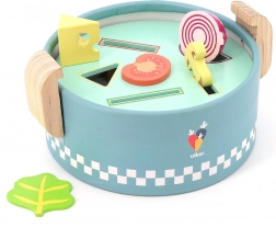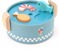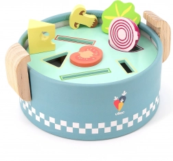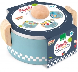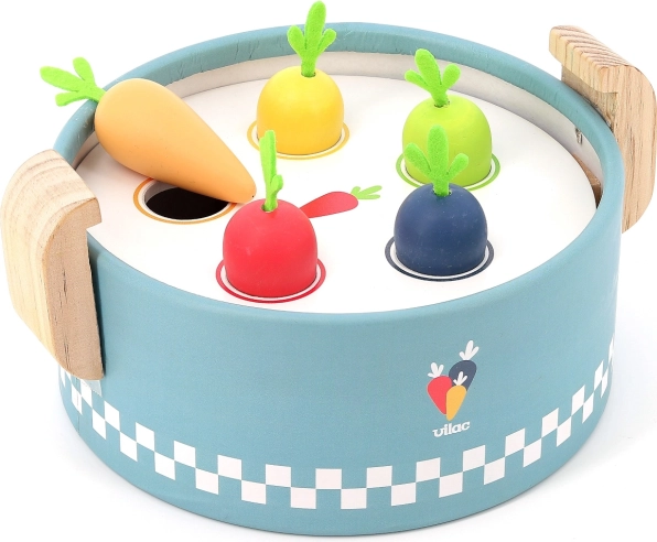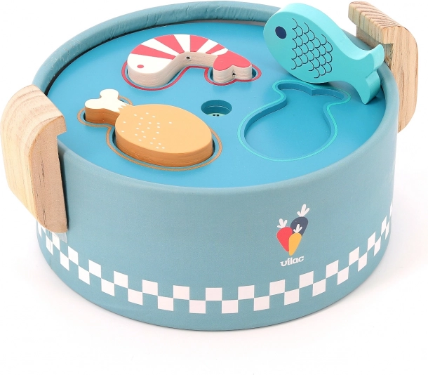 VILAC vkladací mini hrniec je šikovná drevená hračka pre najmenších od 18 mesiacov. Pod vekom sa ukrývajú tri vymeniteľné dosky s rôznymi tvarmi, do ktorých deti vkladajú alebo vhadzujú farebné kúsky potravín. Vzniká tak „varenie“ ako naozaj, ktoré rozvíja fantáziu aj praktické zručnosti.