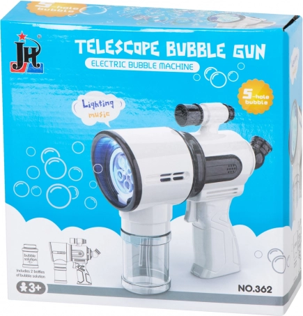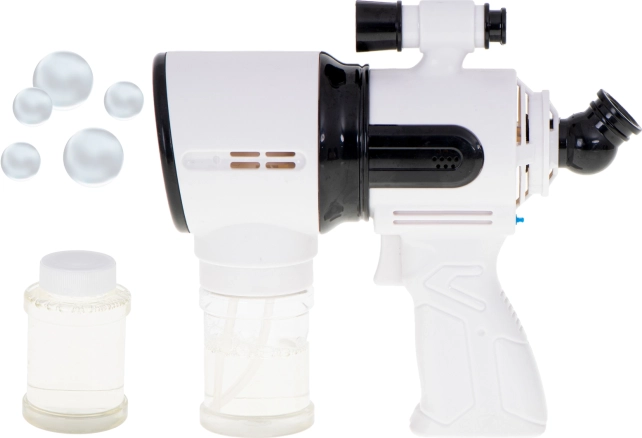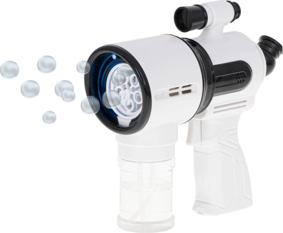 Táto biela pištoľ na bubliny je ideálna pre deti od 3 rokov aj rodinné vonkajšie akcie. Integrovaný ventilátor a systém s 5 krúžkami zabezpečujú plynulé fúkanie a prúd desiatok až stoviek bubliniek na jedno stlačenie spúšte. Pre väčšiu zábavu nechýba LED podsvietenie a zvuky, ktoré možno jedným tlačidlom zapnúť alebo vypnúť.