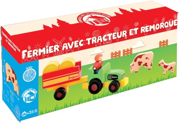 Drevená postavička farmára s traktorom, prívesom a zvieratkami od značky Jeujura. Ideálny doplnok k dreveným stavebniciam. Kombinujte a tvoríte nové príbehy.