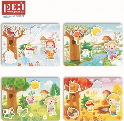 Kedy robíte snehové gule? Kedy môžete ísť do lesa zbierať lesné plody a huby? Sada obsahuje 4 veľké pružné plastové doštičky so suchým zipsom a 20 samostatných dielikov, ktoré umiestnite na doštičky pomocou suchého zipsu. Vďaka tejto vychytávke jednotlivé diely len tak nespadnú a budú držať na správnom mieste.