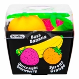 Tri ovocné loptičky v tvare banánu, jahody a pomaranča so svetlými farbami poskytujú vizuálnu a hmatovú stimuláciu.