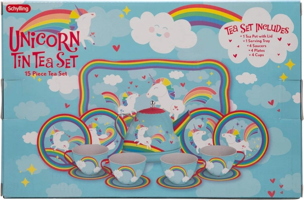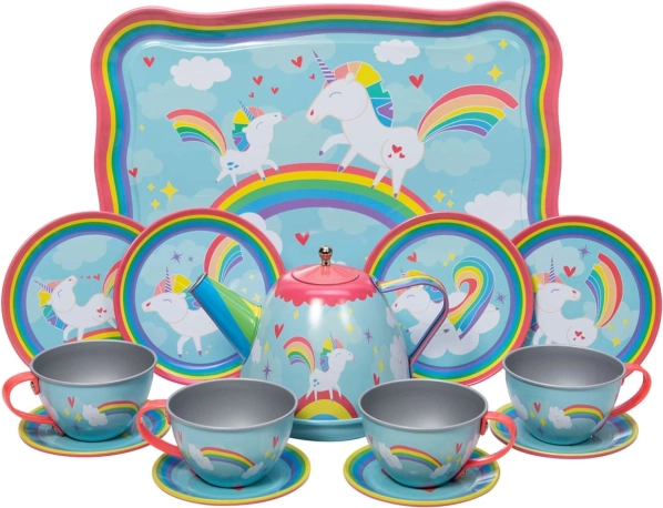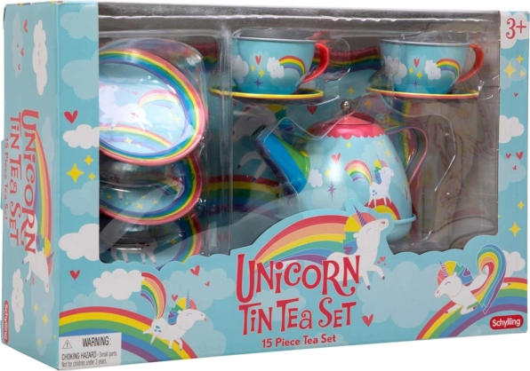 Rozkošná čajová súprava s motívom jednorožca poteší malé hostiteľky aj hostiteľov. Obsahuje 15 dielov z odolného kovu – šálky, podšálky, tanieriky, kanvičku s pokrievkou a servírovací tácku 24 × 16 cm. Ideálna na predstierané čajové posedenia a rozvoj kreativity aj sociálnych zručností. Vhodné pre deti od 3 rokov.
