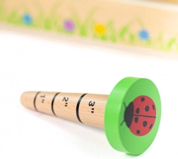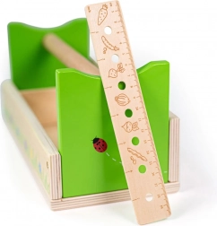 Táto farebná záhradnícka sada rozvíja detskú zručnosť, trpezlivosť a vzťah k prírode. Všetko je uložené v pevnej drevenej prepravke so sviežim zeleným dizajnom s lienkami a kvetmi. Deti si môžu bezpečne vyskúšať sadiť, kypriť či merať a pritom napodobňovať dospelých.